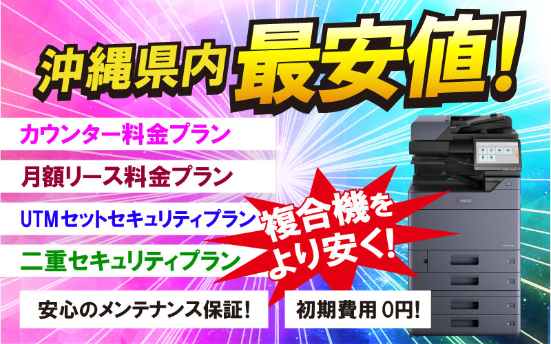 複合機(コピー機) 沖縄県内最安値!弊社の複合機で経費削減!SPEED LINEでは複合機(コピー機)を多様なプランで販売・リースを行なっております。 カウンター料金プラン(モノクロ0.6円/枚〜・カラー6円/枚〜) 月額リース料金プラン(6年リース月額2,800円(税別)A4カラー複合機) UTMセットセキュリティプラン(統合脅威管理!特別価格でご提供) 二重セキュリティプラン(UTM・NASのダブルセキュリティ!)